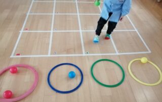 Ci siamo divertiti a pescare le palline colorate con i piedi , le abbiamo divise a seconda del colore, abbiamo fatto il reticolo seguendo il percorso in base al colore e posizionato le palline nel cerchio.