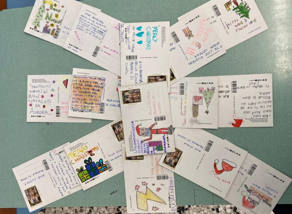Le cartoline, dopo la cerimonia di timbratura a cui hanno partecipato le insegnanti e il Dirigente, verranno recapitate ai bimbi della scuola primaria di Villanova Mondovì, gli stessi che invieranno i loro auguri speciali alla classe quinta.